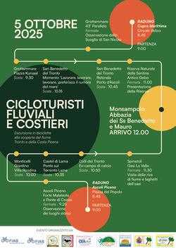 Co-organizzato dai Cea “Torre sul porto” del comune di San Benedetto, “Ambiente e mare”, “Giano”, “La Contea”, “Asa Speleoclub”, “Rifugio escursionistico Mario Paci” e “Oasi La Valle”, con l’importante contributo dei volontari delle sezioni Fiab (Federazione italiana ambiente e bicicletta) di Ascoli e San Benedetto, l’evento, aperto a tutti, ha lo scopo di far conoscere le caratteristiche ambientali del fiume Tronto e del tratto costiero da Cupra Marittima a San Benedetto, pedalando lungo le ciclabili e le strade.