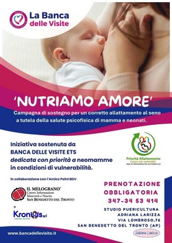 In occasione della Settimana mondiale dell’allattamento (Sam) prende il via “Nutriamo Amore”, una campagna di sostegno che offre consulenze gratuite a neomamme e famiglie. L’iniziativa è promossa da La Banca delle Visite Ets, in collaborazione con Il Melograno - Centro informazione maternità e nascita di San Benedetto e Kronos impresa sociale, con una particolare attenzione alle famiglie in condizioni di vulnerabilità.