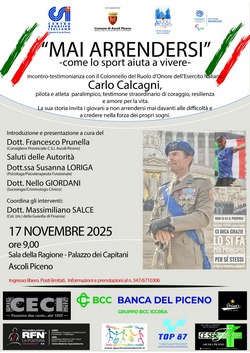 Lunedì 17 novembre (ore 9), la Sala della Ragione di palazzo dei Capitani di Ascoli, ospiterà un evento di grande valore umano ed educativo: “Mai arrendersi - come lo sport aiuta a vivere”, incontro-testimonianza con il colonnello del Ruolo d’Onore dell’Esercito italiano Carlo Calcagni, pilota e atleta paralimpico, esempio straordinario di coraggio, resilienza e amore per la vita.