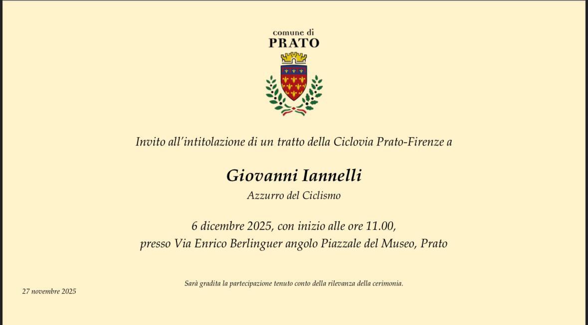 La cerimonia, promossa dal comune di Prato, si terrà alle ore 11, in via Enrico Berlinguer, all’angolo con piazzale del Museo. Sarà un momento di raccoglimento e di comunità, aperto a tutti coloro - cittadini, sportivi, amici e appassionati - che vorranno partecipare e rendere omaggio a Giovanni Iannelli, affinché la sua storia non venga dimenticata e possa contribuire a costruire un futuro più sicuro per tutti i ciclisti.