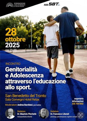 Il rapporto tra genitori e figli e lo sport come strumento di educazione sono solo alcuni degli spunti che il convegno “Genitorialità e adolescenza, attraverso l’educazione allo sport” metterà al centro dei suoi obiettivi. L’incontro aperto al pubblico che si terrà, martedì 28 ottobre (ore 21), nella sala conferenze dell’hotel Relax di San Benedetto sostenuto dalla Fondazione Carisap e promosso dall’associazione Asd Sbt Team, registra la presenza del neuropsichiatra Maurizio Pincherle e dello psicoterapeuta Francesco Liberati.