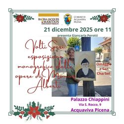 Domenica 21 dicembre (ore 11), nel palazzo Chiappini - casa comunale di Acquaviva Picena sarà allestista una mostra dal titolo “Volti sacri: esposizione monografica delle opere di Monica Alberti”, con la presenza del sindaco Sante Infriccioli, dell’assessore alla cultura Marianna Spaccasassi e dell’assessore alle politiche sociali Piera Rossi.