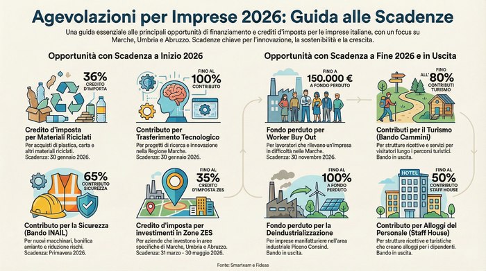 Il 2026 si annuncia come un anno cruciale per le imprese che intendono investire, innovare e rafforzare la propria competitività. A fare chiarezza in un panorama spesso complesso è il nuovo calendario delle agevolazioni pubblicato da Smarteam società cooperativa e Fideas srl, due realtà di riferimento nella consulenza aziendale e nella finanza agevolata. Una guida pensata per accompagnare aziende di ogni dimensione tra contributi a fondo perduto, crediti d’imposta e bandi strategici, aiutandole a pianificare con anticipo gli investimenti futuri.