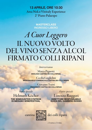 “A cuor leggero, il nuovo volto del vino senza alcol”, che avrà come relatori l’enologo Marco Pignotti, la responsabile commerciale Cecilia Guglielmi e il presidente della Cantina dei Colli Ripani Giovanni Traini